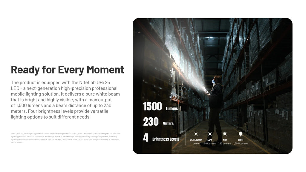 - 最高 1500 流明亮度輸出, 最大光強12400cd, 最遠射程230 米