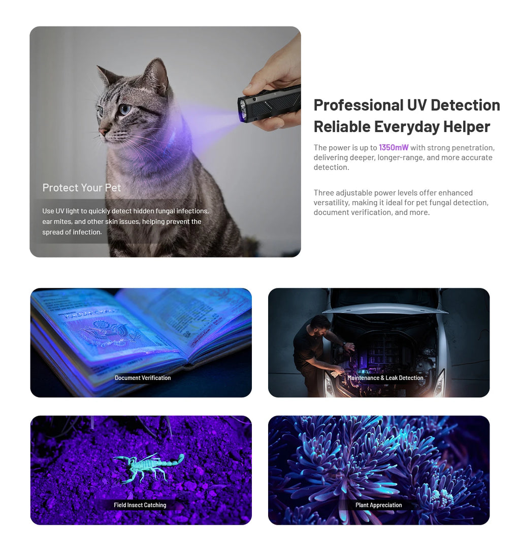 - 設有4擋白光亮度、3擋紫外光和綠激光可選
