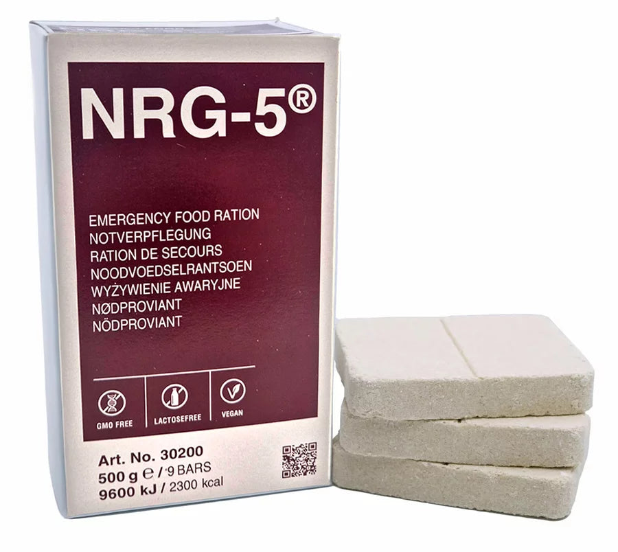 • NRG-5® 緊急食品口糧,採用高品質成分強化。每包NRG-5®(500克/2300千卡)可滿足成人每日能量需求。即食無需加熱或煮沸,亦適用於6個月以上幼兒。將壓縮條搗碎並加水,即可製成營養糊狀物或飲品,具體取決於加水量。