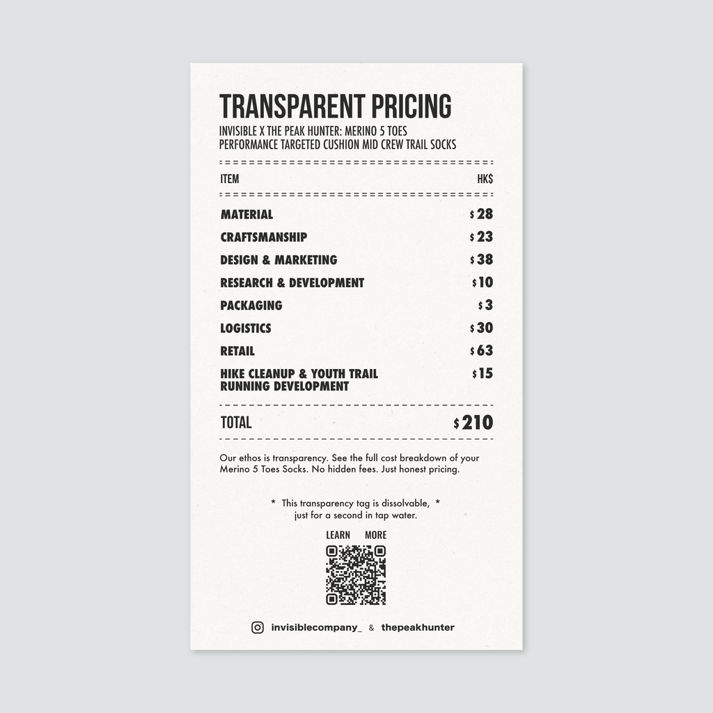 | 原材料 | $28 | | 工藝 | $23 | | 設計及營銷 | $38 | | 包裝: #INVISIBLEBAG 2.0 | $3 | | 物料 | $30 | | 零售營運 | $63 | | 淨山活動 | $15 | | 合共 | $210 |