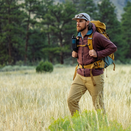 • Carry less water and filter on the fly. Building on the innovative PackFlask™ design, this enhanced system features an integrated filter for fast, reliable hydration on the trail. Simply find a water source, fill and drink directly through the high-flow, self-sealing nozzle. The filter screws securely onto the flask, doubling as a squeeze filter for filling bottles or pots at camp. The stretch-mesh pouch securely attaches to your pack harness for hands-free use.