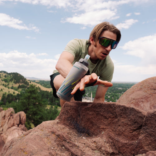 • Logging miles on hot days or racing in the summer heat — staying cool is key. This minimalist handheld keeps hydration cool 38% longer than a standard flask. An innovative thumb loop allows you to hold the flask securely without gripping or squeezing. Versatile and ambidextrous, it can be fitted to either hand. The adjustable, sweatproof strap fits most hand sizes and snuggly stays in place with a Velcro-style closure. Topped with our SpeedFill™ Cap for quick refills on the go.